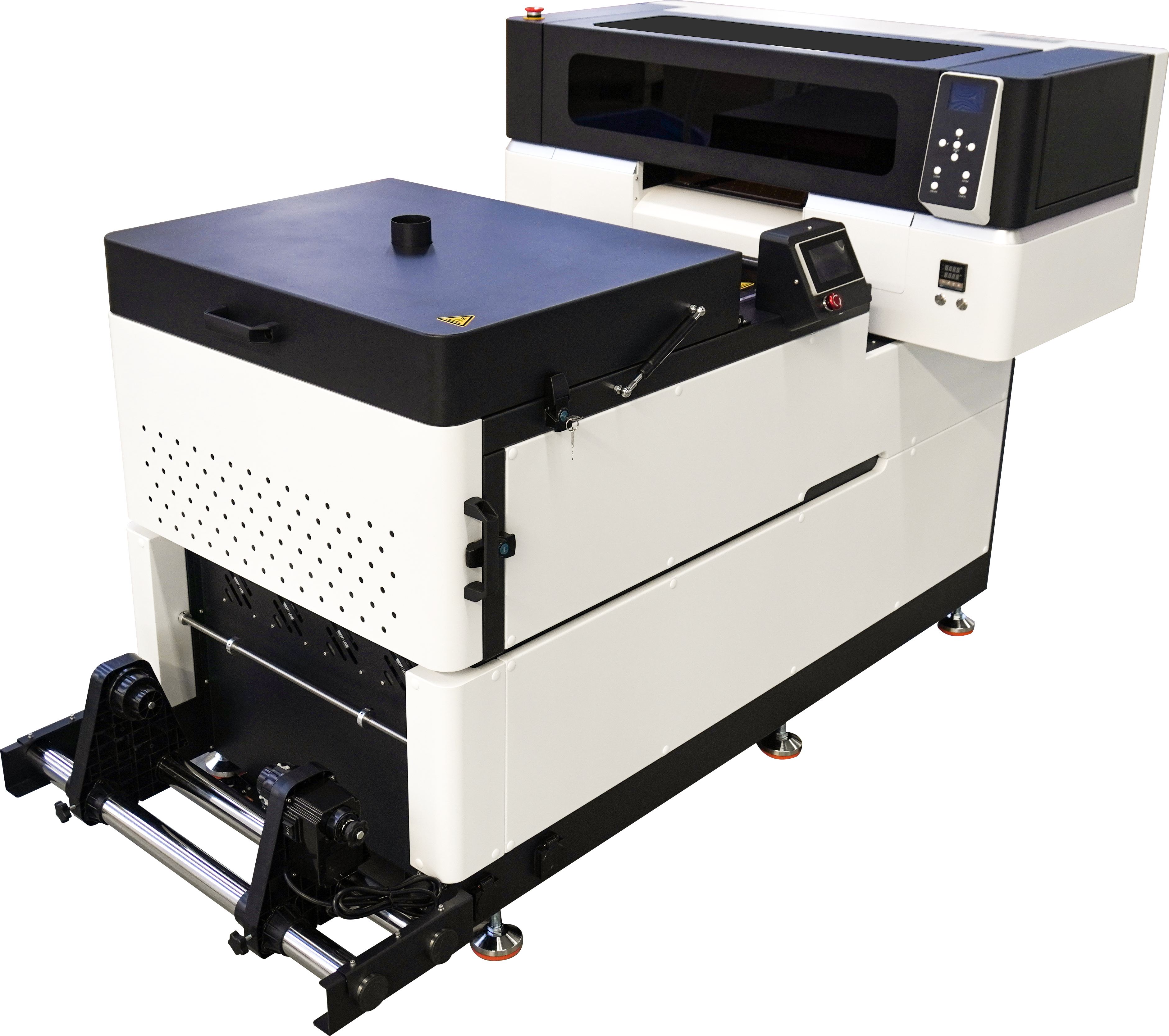 Шейкер B300-Pro с рабочей зоной 30 см (в составе моноблока) полностью синхронизирован с принтером и оснащён двумя зонами нагрева, благодаря чему предотвращается деформации пленки, нет необходимости в дополнительном центрировании. Есть отсек для повторного использования клея. Управление через сенсорный экран.